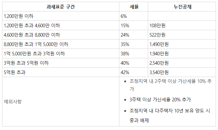 양도소득세는 양도 금액에서 취득가액 취등록세 경비등을 제외하고 남은 금액에 대해서 부과가 됩니다. 세율은 아래표와 같으며, 조정지역 내에 2주택 이상인 경우 10%가 추가됩니다. 또한 3주택이상이면 20%가 추가되니 참고하시길 바랍니다.